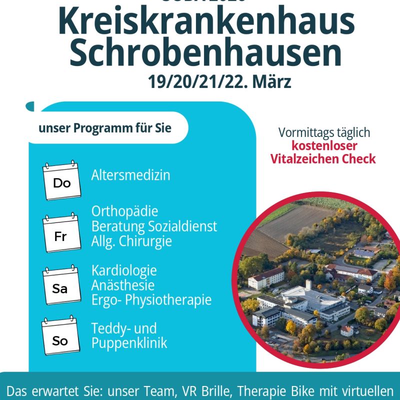 Das Kreiskrankenhaus Schrobenhausen lädt Sie herzlich zu regelmäßigen Informationsveranstaltungen rund um medizinische Themen ein. Mit unseren Vorträgen und Veranstaltungen möchten wir Ihnen fundiertes Wissen zu Gesundheit und Vorsorge vermitteln und gleichzeitig einen Raum für Austausch und Fragen bieten.