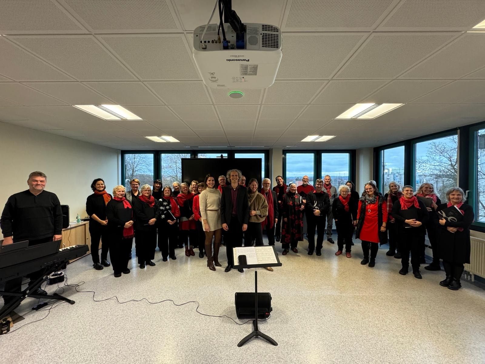 Nach dem Konzert ging es weiter durch die Stationen. Die Sängerinnen und Sänger stellten sich auf den Fluren auf und sangen a cappella bei offenen Türen für die Patientinnen und Patienten, die aus verschiedenen Gründen im Zimmer bleiben mussten.